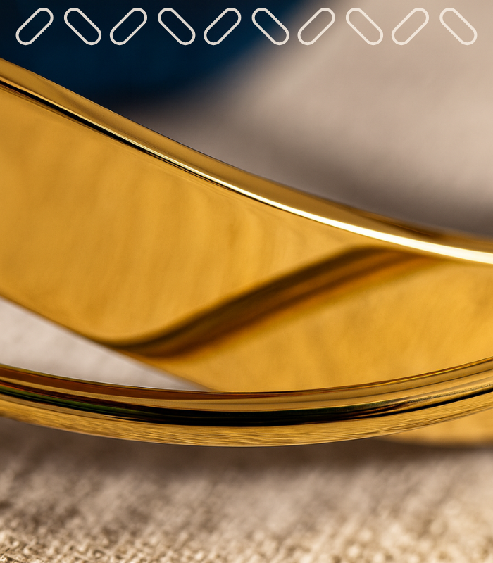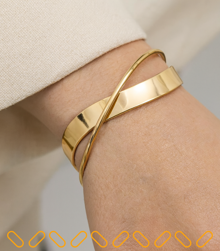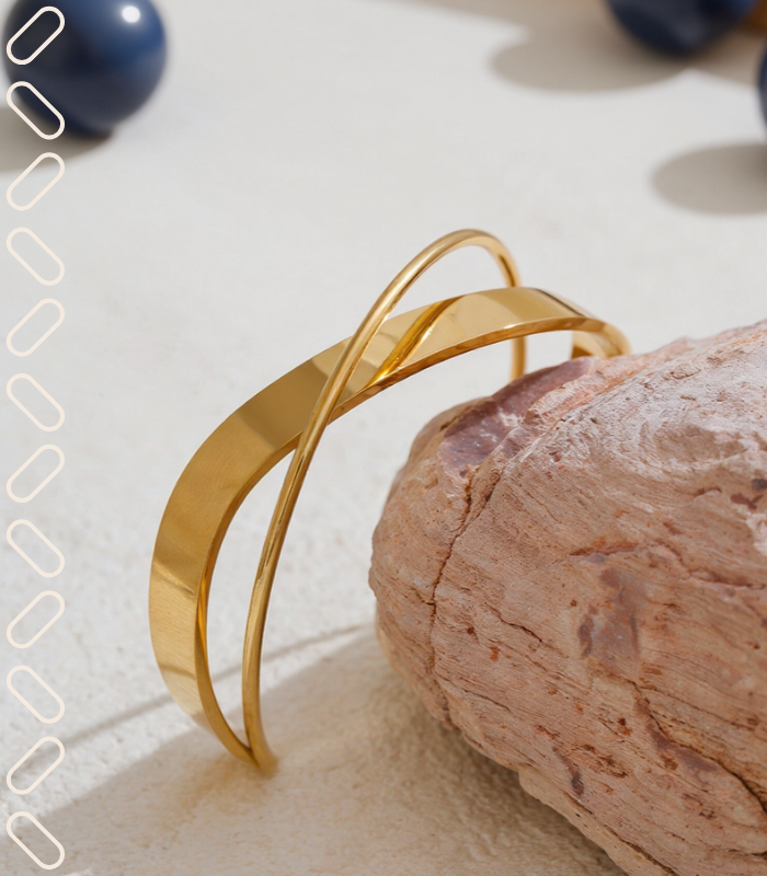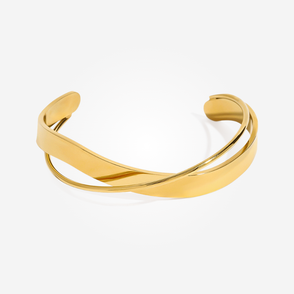 A sleek crossover gold cuff featuring intertwined lines for a refined, modern touch. Comfortable, hypoallergenic, and effortlessly transitions from casual moments to evening elegance.